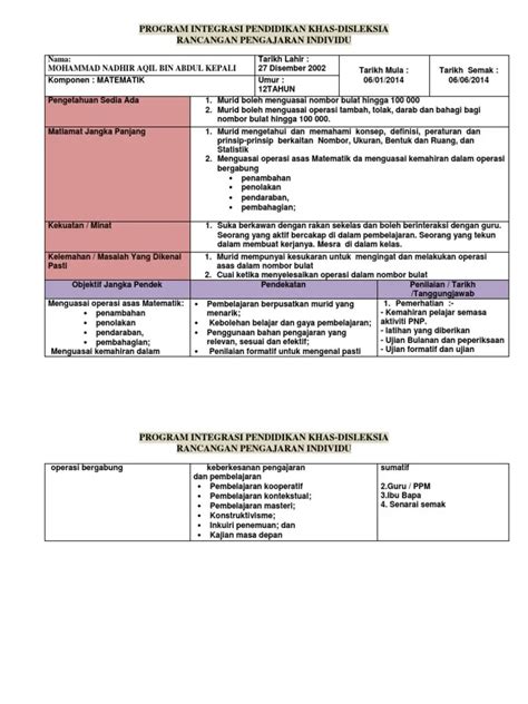 Contoh Rpi Pendidikan Khas  Rancangan Pendidikan Individu Akademik